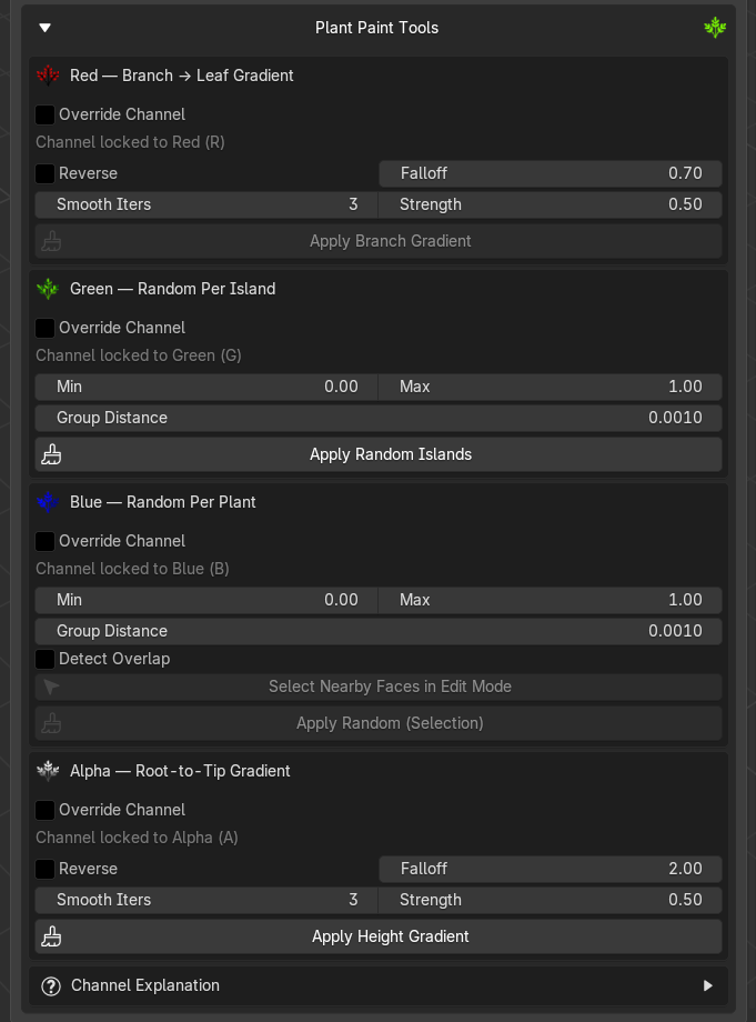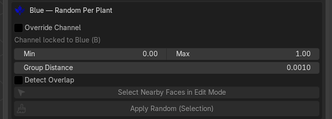 Group Distance (default 0.001) Used by Select Nearby, when expanding a selection, any island with a vertex within this world-space distance gets included in the group. Same concept as the Green Group Distance, but used here to pre-select a whole plant (leaves + stem + sub-parts) before painting.