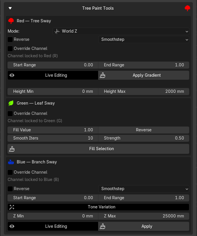 By default the gradient is locked to Red (G) since that's the Tree Sway channel convention. Enabling this lets you redirect the output to R, B, or A if needed.