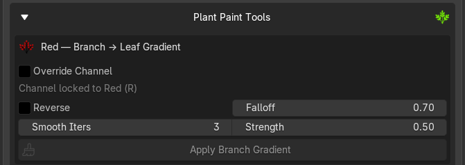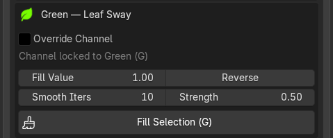 Smooth Iterations, how many passes of averaging to run. 0 = no smoothing, sharp edge at the selection boundary. Higher = softer transition. Strength, how much each iteration pulls toward the neighbour average. 0.0 = no effect, 1.0 = fully replace with neighbour average each pass. Useful when leaf islands are close together and a hard value jump would look unnatural in the wind simulation.