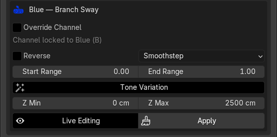 A world-Z fade mask applied on top of everything else. Vertices below Z Min receive 0 (no sway), vertices above Z Max receive the full computed value, and anything between fades smoothly. Useful for suppressing branch sway at the base of a tree where branches meet the trunk.