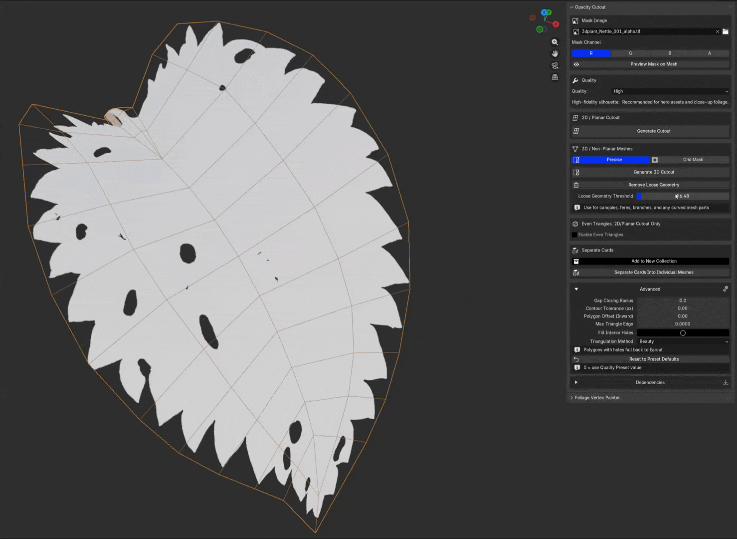 When you run a cutout on a texture atlas that contains multiple disconnected shapes — for example a leaf atlas with eight individual leaves — the result is a single mesh object containing all of them as separate loose parts.