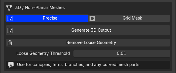 This is the main mode for converting existing canopy meshes into cleaner Nanite-ready geometry. It keeps your mesh in 3D, but trims away the invisible parts so the final canopy better matches the texture silhouette.