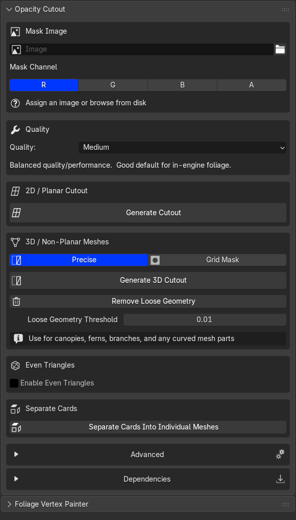 You do not need a dedicated mask texture A basecolor / albedo / diffuse texture with an alpha channel works perfectly. Set the Channel picker in the panel to A and the addon reads the alpha directly. This is the most common setup for Megascans and Quixel foliage assets where the opacity is baked into the RGBA texture.